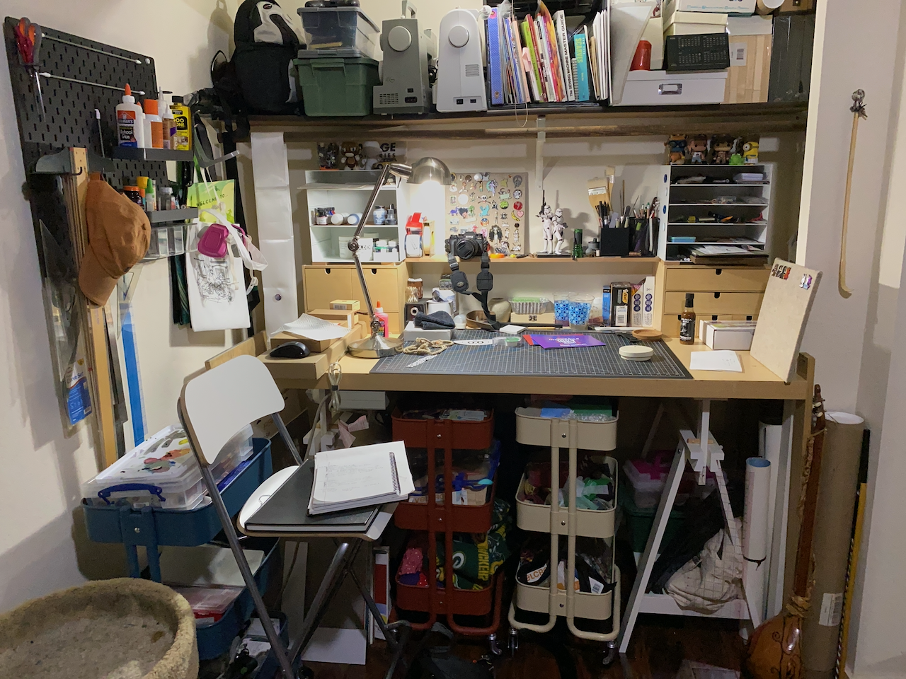 Yep. That is my current craft corner. And this is a tidy view of the space. My artistic interests have been all over the place for most of my life. I always like to draw. Photography was a big part of my life since middle school. I also learned wood and metal working then. College introduced me to ceramics and painting. Graduate school added book arts. Then post education, I acquired computer imaging skills and 3D design. (I won’t call it modeling. Just never acquired that skillset.) More recently, I’ve added sewing and foam smithing to my skills kit.